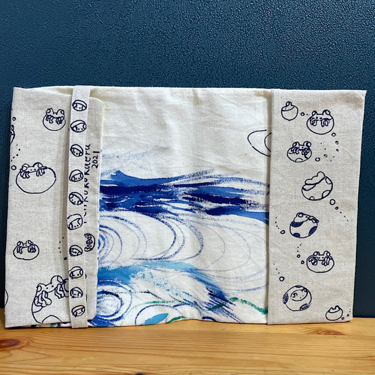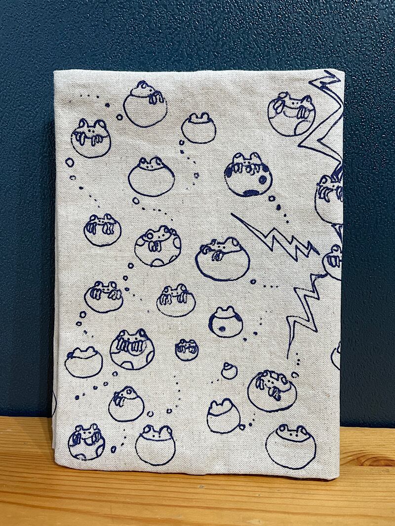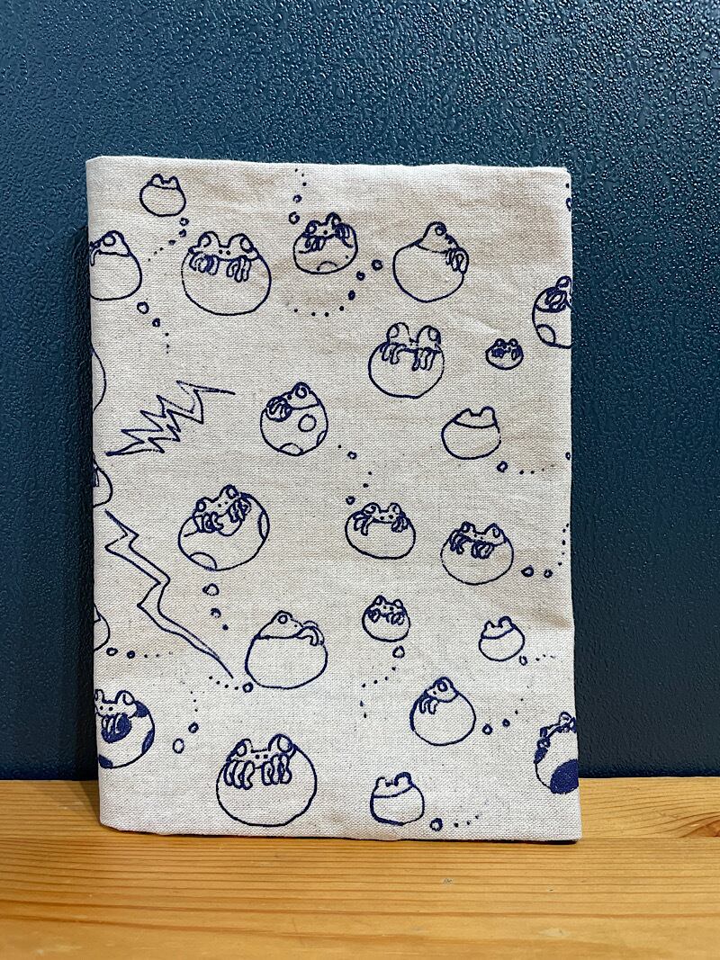 テンココカエルという澤田礼美の絵の世界のキャラクター、「テンココカエル玉」という毛布玉に乗っかって空を自由に飛び回る蛙をメインにデザインされた一点もののブックカバーとなります。